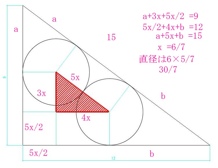元の直角三角形が3:4:5で、赤い三角形も相似なので私は赤い三角形の辺の長さを3x:4x:5xで考えました。