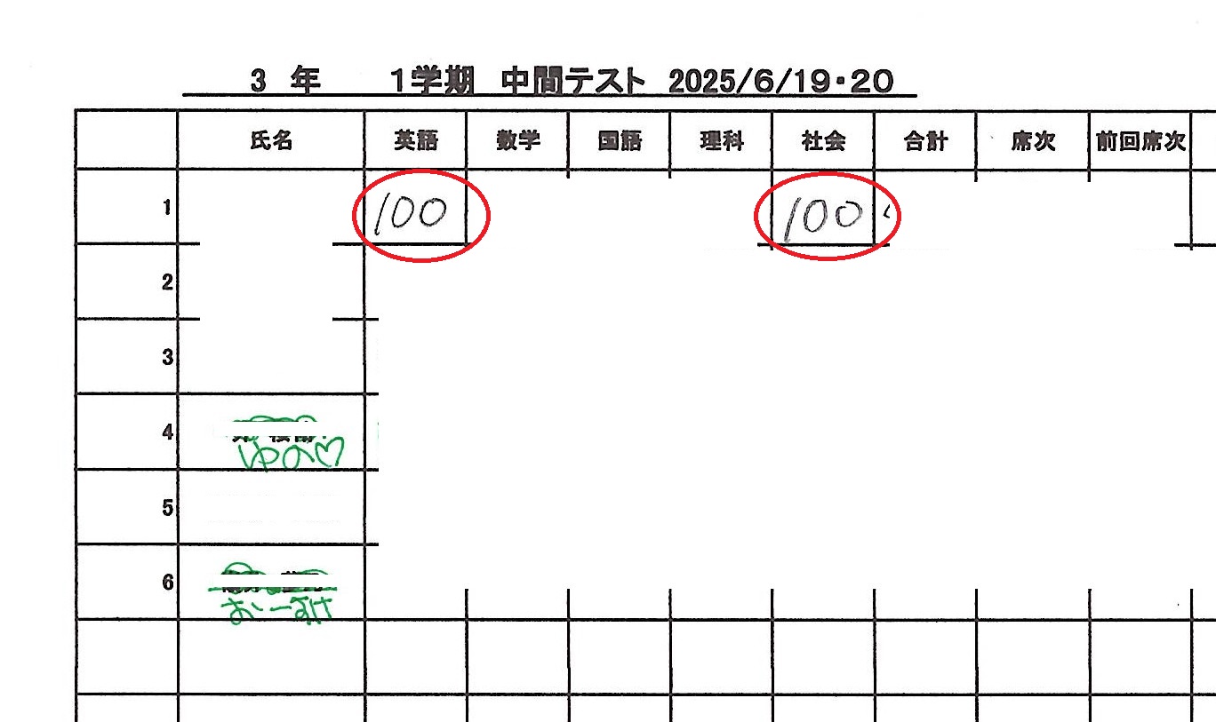 これまで2回連続して100点を取った生徒。先日のテストでは2科目も100円だった。100点取ると500円の図書カードをご褒美としてあげている。今回は1,000円分。うれしい悲鳴。