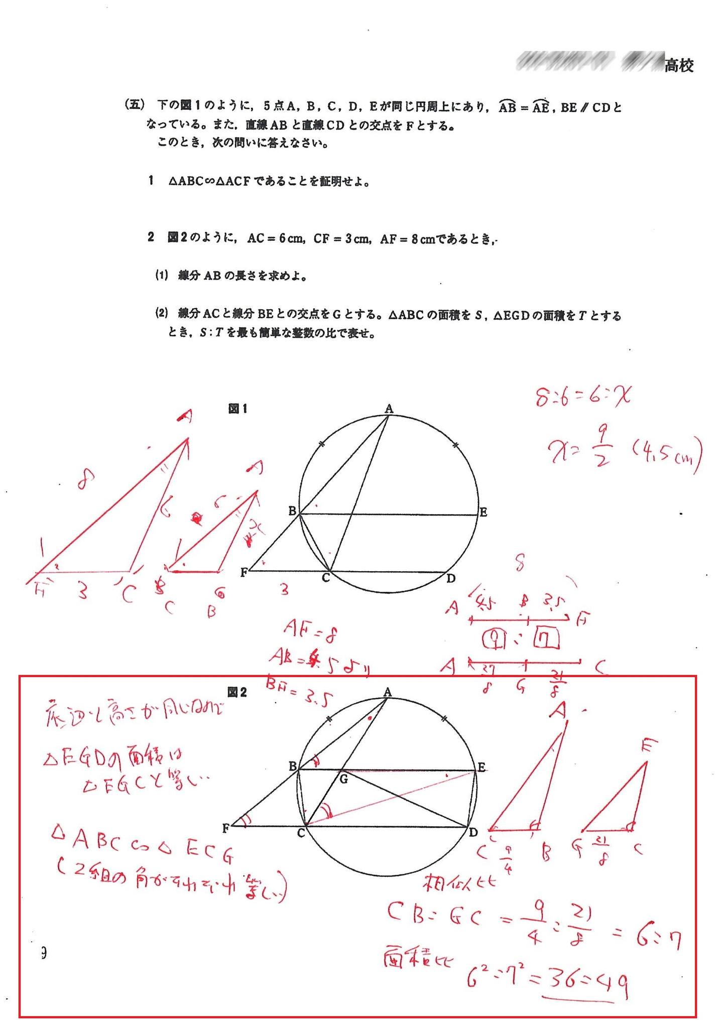 この高校の過去問題を初見で解けず宿題にしてもらった。自宅に持ち帰って見直してみて閃いた。三角形の底辺と高さが等しければ面積が同じになる(等積変形)。これで解決!!めでたしめでたし。
